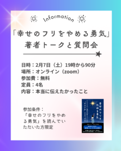 私の著書『幸せのフリをやめる勇気-フラクタル心理学が教えてくれた「本当の自分」の見つけ方』を読んでくださった方対象に「著者トークと質問会」を開催します。